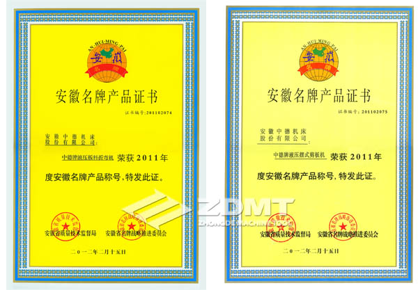 2012年3月22日,馬鞍山市召開了全市質(zhì)量技術(shù)監(jiān)督工作會議,會議對2011年獲得質(zhì)監(jiān)部門相關(guān)榮譽的企業(yè)與個人進行了表彰,我公司中德牌液壓擺式剪板機和中德牌液壓板料折彎機兩個產(chǎn)品分別通過了2011年“安徽名牌”的復審。